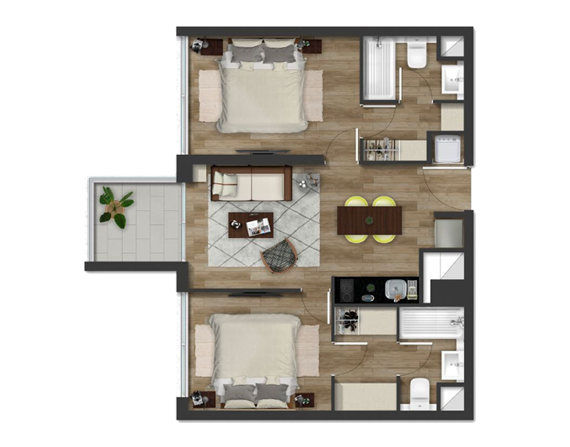 Características y terminaciones: piso SPC vinílico y gres porcelánico. Ventanas termopanel y barandas de vidrio. Cocina con cubierta de cuarzo negro, equipada con encimera vitrocerámica, horno y campana.