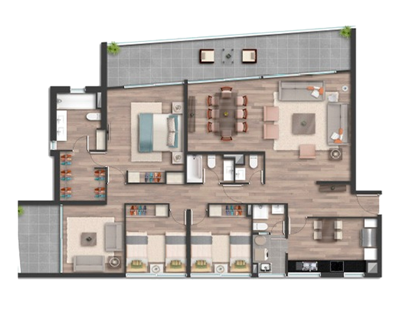 Características y terminaciones: piso vinílico flotante WPC y gres porcelánico en terrazas. Ventanas termopanel de PVC con folio color madera. Cocina con cubierta de cuarzo Silestone y terrazas con barandas de cristal templado. Todos los departamentos en piso 2 vienen con cierro de vidrio templado para que disfrutes tu terraza en toda época.